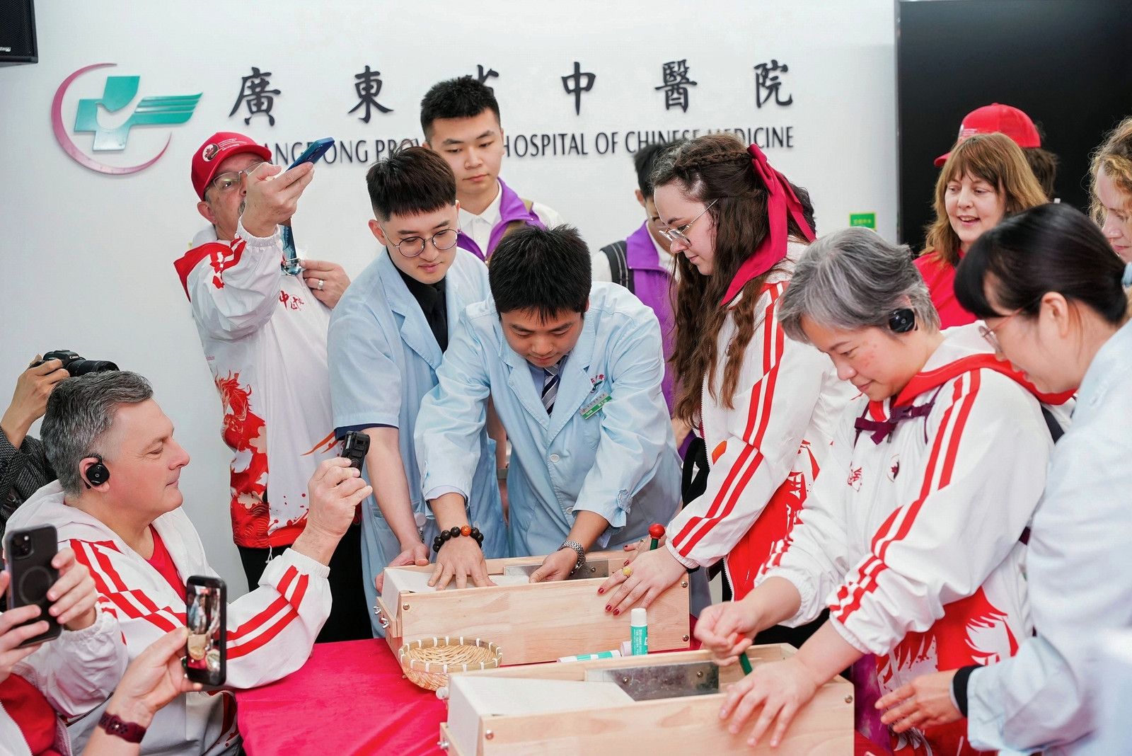 下午,交流团一行到访beat365官方网站第二附属医院(广东省中医院)大学城院区,参观医院智慧药房,直观感受中医药服务集中化、标准化、信息化的发展成果,亲身体验耳穴综合疗法、针灸、拔罐、艾灸、雷火灸等中医药特色外治疗法,并亲手体验了艾条制作。