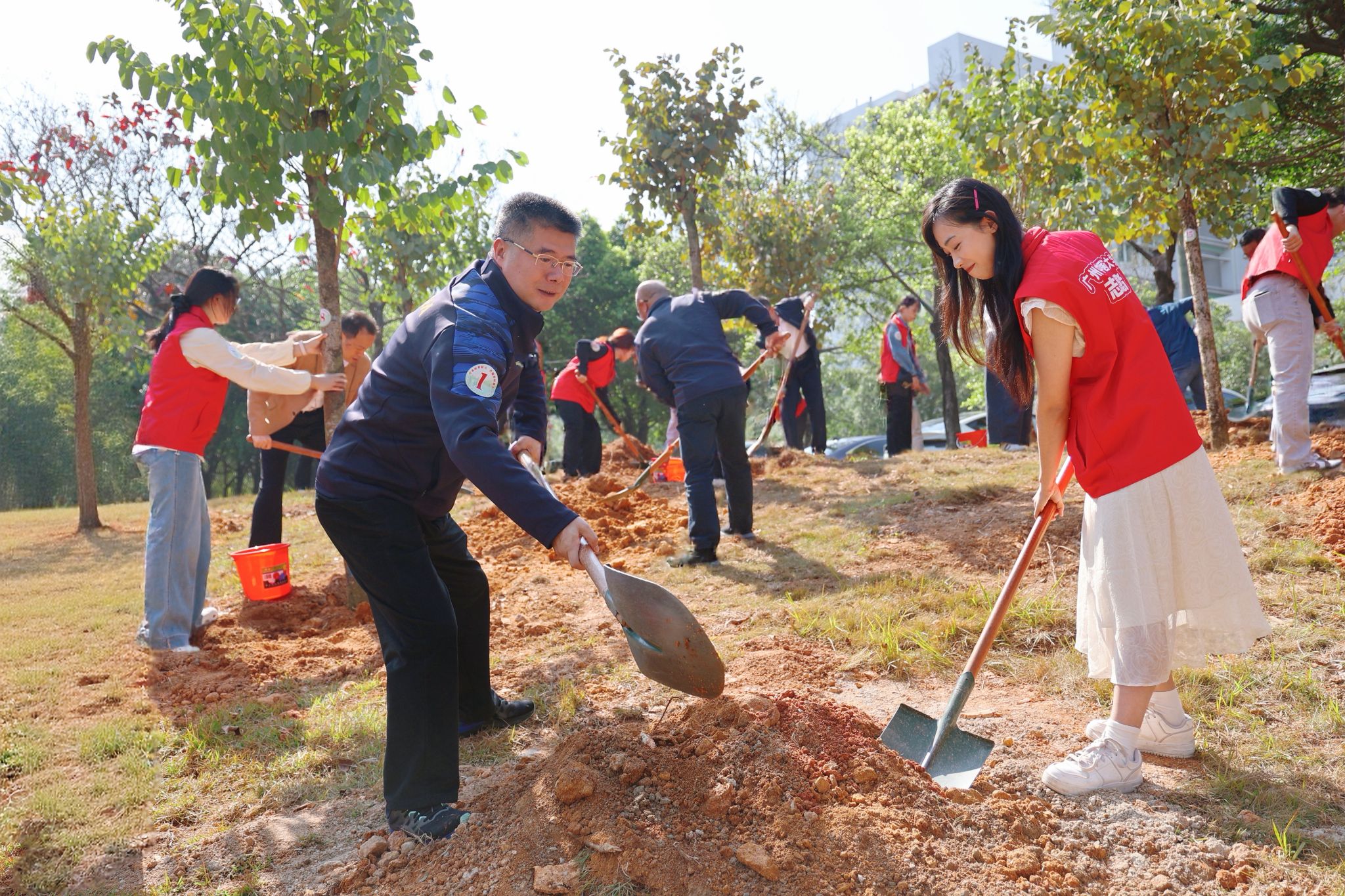 致辞结束后,师生有序投入到植树劳动中,各组分工明确、配合默契,挖坑、扶苗、填土、压实,每一个步骤都一丝不苟。栽植的每一棵树苗都承载着广中医人对生态文明建设的责任与担当,对中医药文化传承的坚守与期盼。