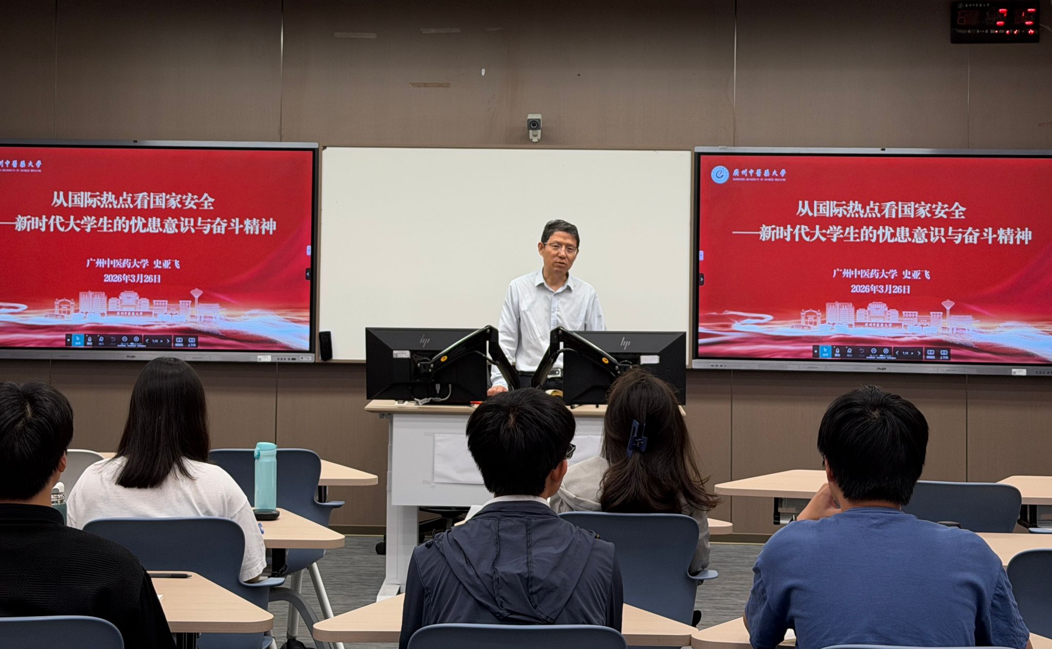 3月26日上午,学校党委常委、副校长史亚飞以《从国际热点看国家安全——新时代大学生的忧患意识与奋斗精神》为题,在教学楼B203智慧课室为2025级中医学(九年制)的同学讲授思政第一课。
