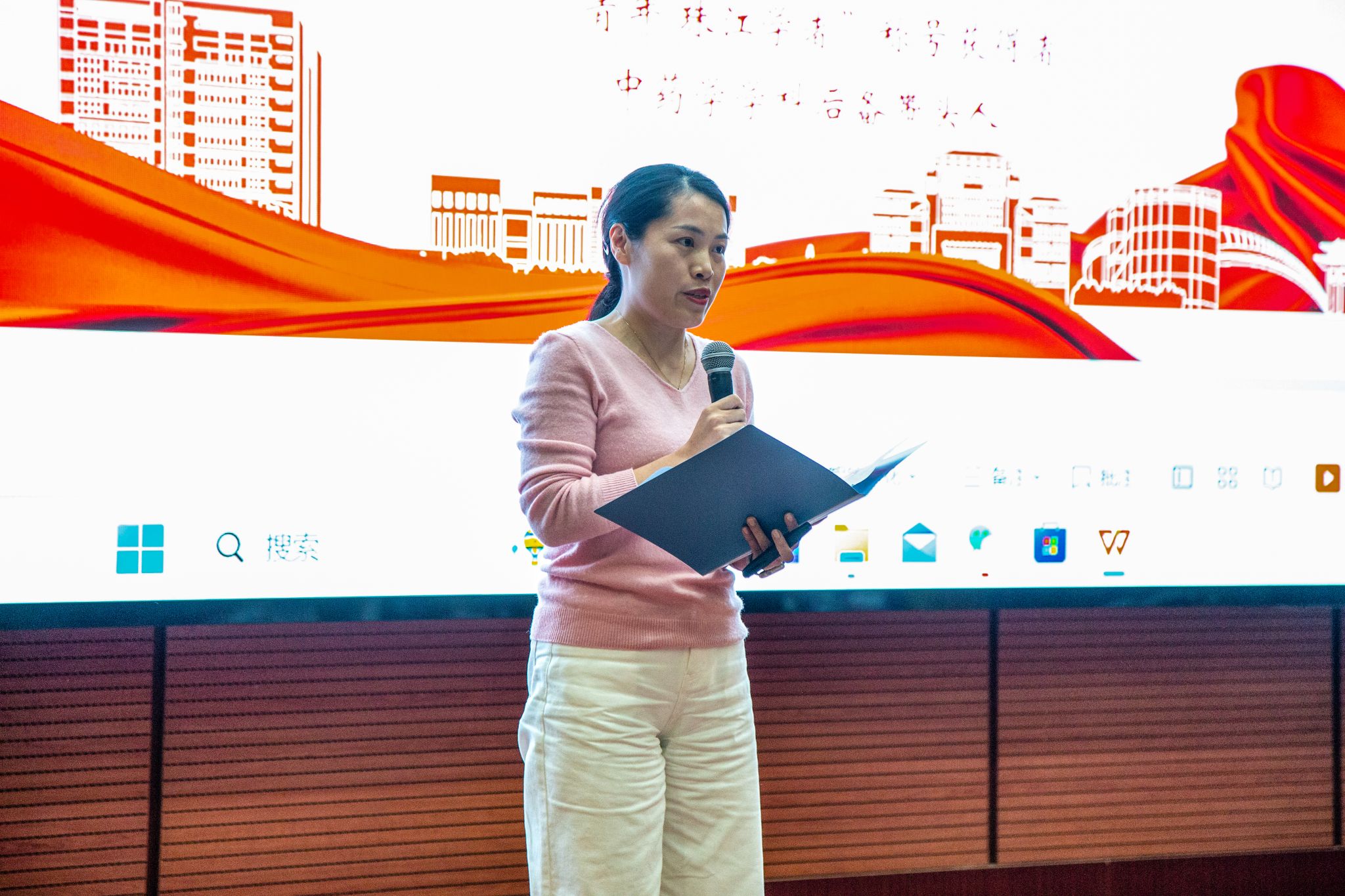 宣讲会以2023年校庆主题原创音乐《岐黄之邦》拉开序幕,燃起全场师生对中医药文化的热爱之情。通过场景化、沉浸式的《典籍里的中医——白芍之事》舞台剧表演,生动讲述了白芍花的药用价值,引领师生阅读典籍、对话前辈医家,感受深厚的中医药文化底蕴。校艺术团合唱队深情合唱《领航》,激励着广大师生砥砺前行,把宣讲会活动推向高潮。