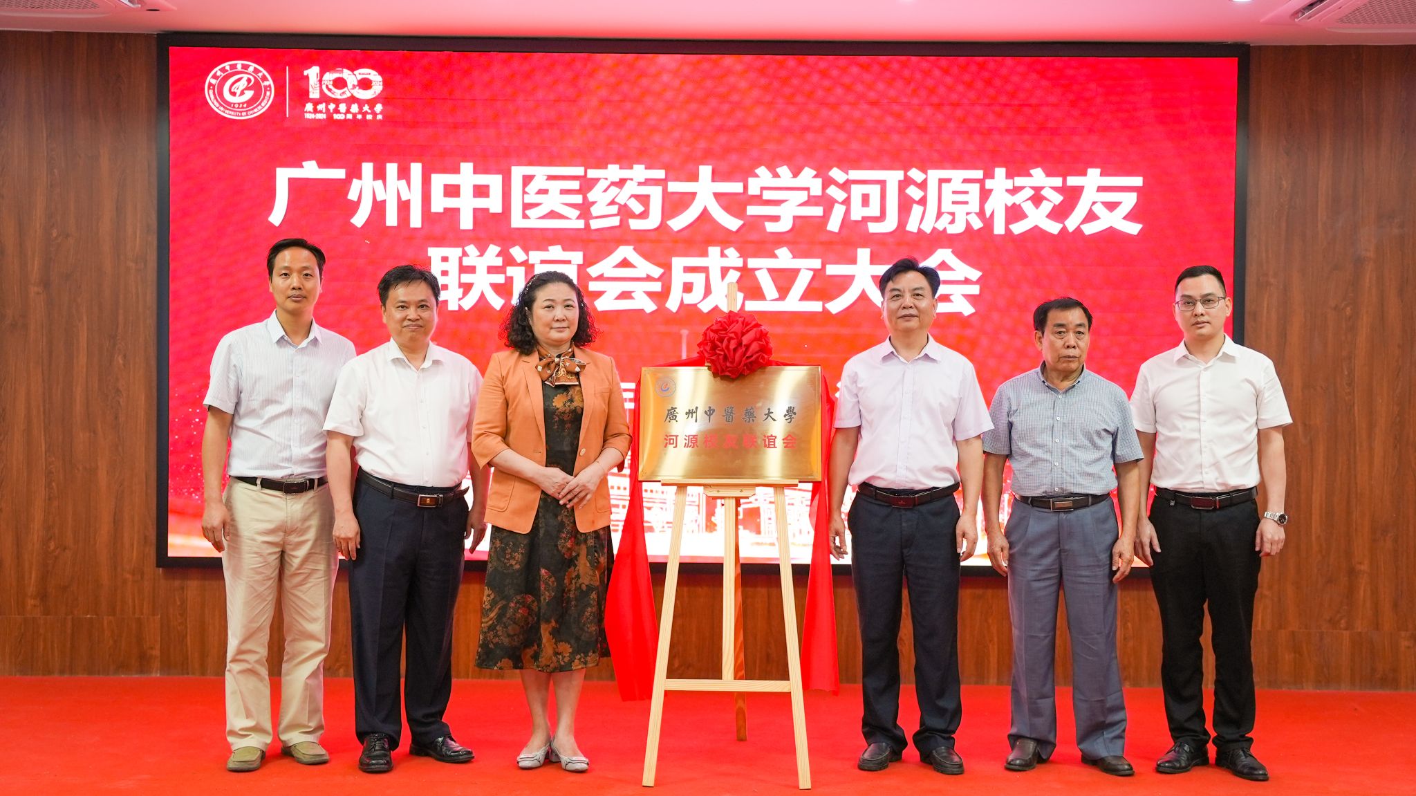 潘华峰副校长、人力资源部詹若挺部长、校友会任长报、校友联谊会副会长肖新李、校友联谊会顾问、省名中医张赞中和东源县中医院副院长彭志华共同为beat365官方网站河源校友联谊会揭牌。