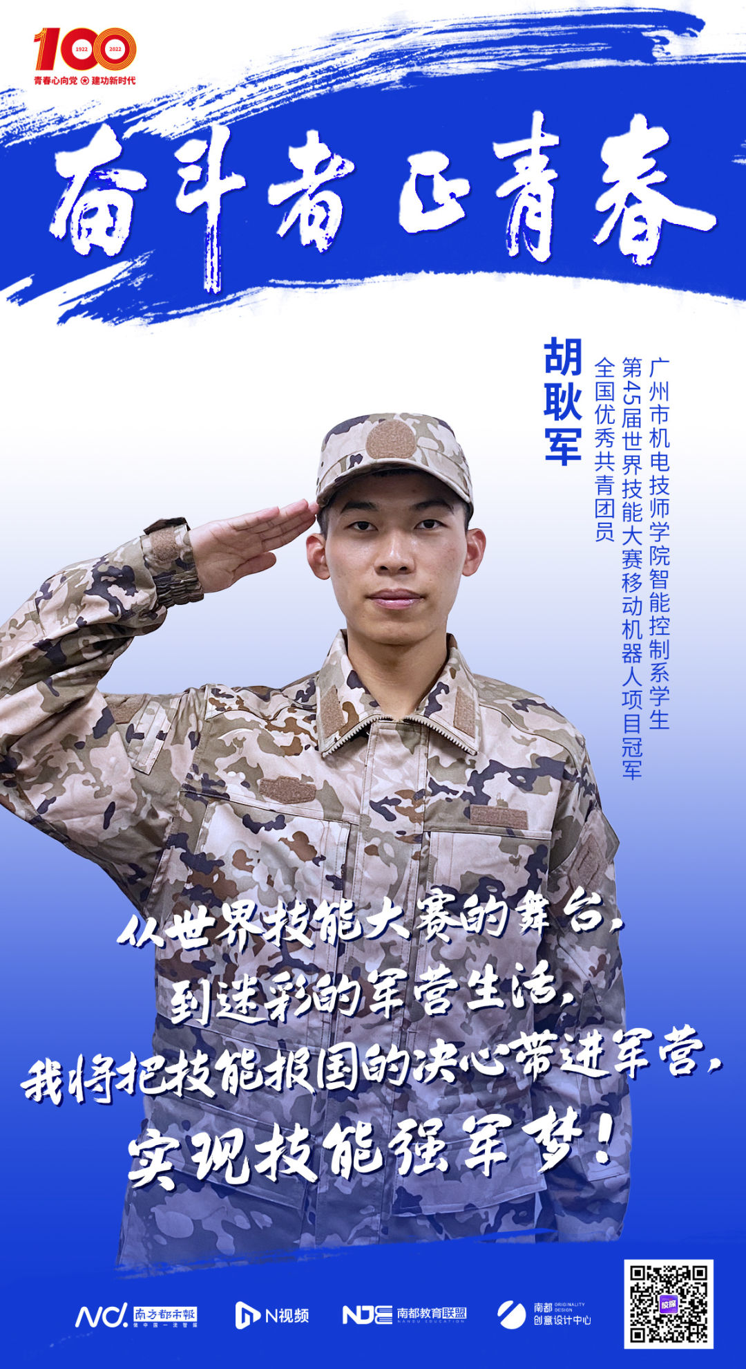 同为职校学子,广州市机电技师学院学生胡耿军向记者表示:“作为一名携技从戎的新时代中国青年新兵,我要把工匠精神带进军营,努力成为勇往直前的后浪。”作为一名共青团团员,他先后荣获“全国技术能手”“全国优秀共青团员”称号,获“广东省五四青年奖章”。