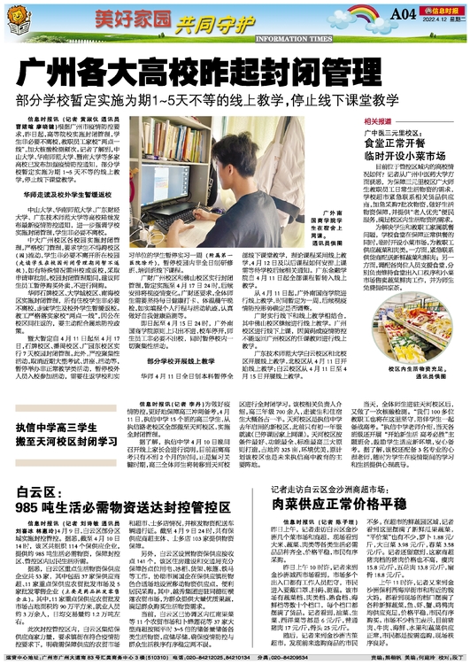 信息时报讯(记者 黄淑仪 通讯员 曹婼喧 廖晓键)根据广州市疫情防控要求,昨日起,高等院校实施封闭管理,学生非必要不离校,教职员工家校“两点一线”,加大核酸检测频次。记者了解到,中山大学、华南师范大学、暨南大学等多家高校已发布加强疫情防控通知,部分学校暂定实施为期1~5天不等的线上教学,停止线下课堂教学。