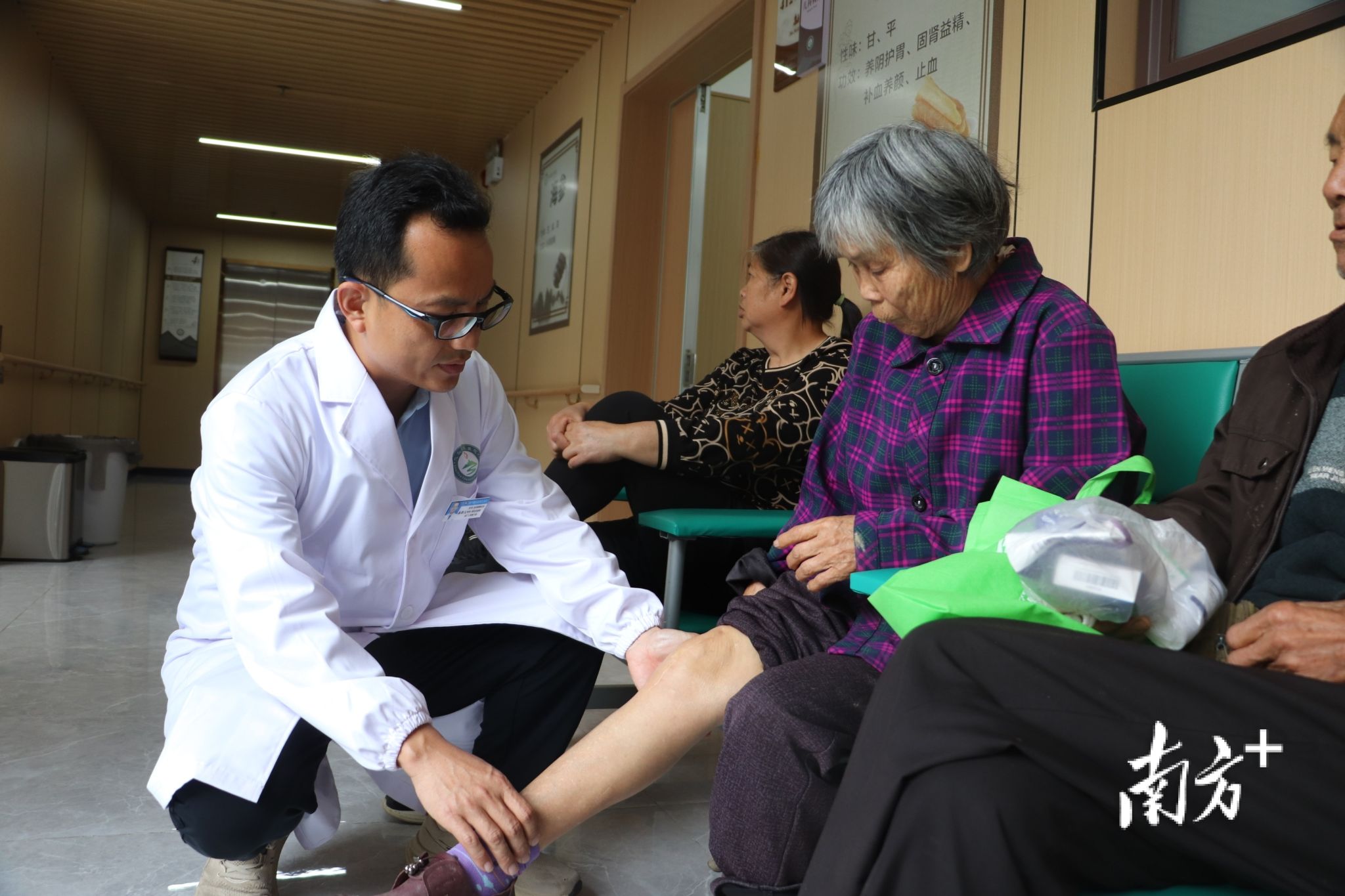 迳头镇已逐步迈入中度老龄化社会,60岁以上老年人占镇上常住人口的34%,院内医养床位都已住满。去年9月开始,徐浩祥每周在迳头镇中心卫生院出诊一次,并到住院部查房。