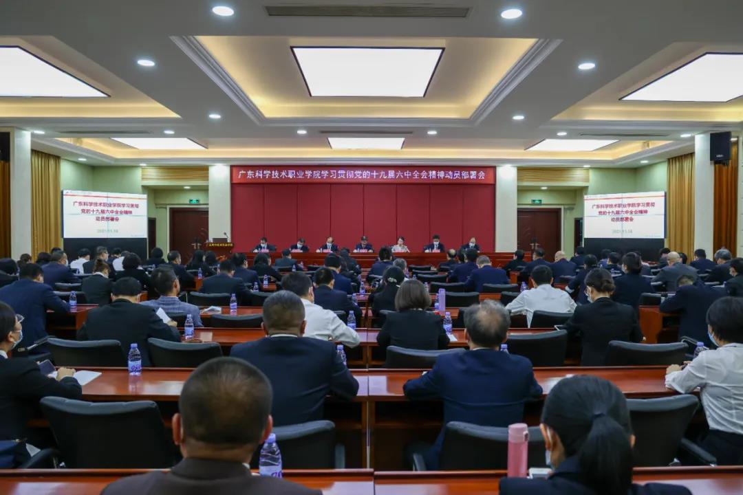 广东科学技术职业学院将学习贯彻党的十九届六中全会精神与贯彻落实习近平总书记关于职业教育重要指示批示精神相结合,与统筹推进学校高质量发展相结合,召开学习贯彻党的十九届六中全会精神动员部署会和“双高校”建设冲刺动员大会,要求将全会精神落实到“双高校”建设具体任务中,把为党育人、为国育才的初心使命融入到办学治校、人才培养全过程,将学习成效转化为推动学校发展的强大动力。