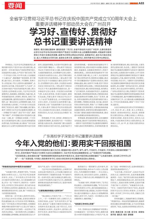 “新时代的中国青年要以实现中华民族伟大复兴为己任,增强做中国人的志气、骨气、底气,不负时代,不负韶华,不负党和人民的殷切期望!”7月1日,庆祝中国共产党成立100周年大会在北京隆重举行,习近平总书记的这番重要讲话,让广东高校学子深有感触。