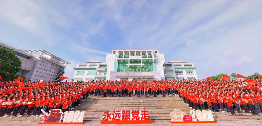 参加活动的师生手执党旗、国旗,身上贴着五星爱心贴纸,口罩上印着“永远跟党走”的图案,党员佩戴党徽,现场气氛在一片红色的海洋中更显热烈、喜庆而庄严。升旗仪式开始前,学校党委书记张建华、校长王伟等学校领导与师生一起大合唱,把歌声献给党,满怀激情的歌声响彻校园。随后,升旗仪式庄严而肃穆,国旗护卫队迈着铿锵有力的步伐走向升旗台,雄壮的国歌响起,鲜艳的国旗升起,现场全体师生肃然而立、行注目礼,齐唱国歌。