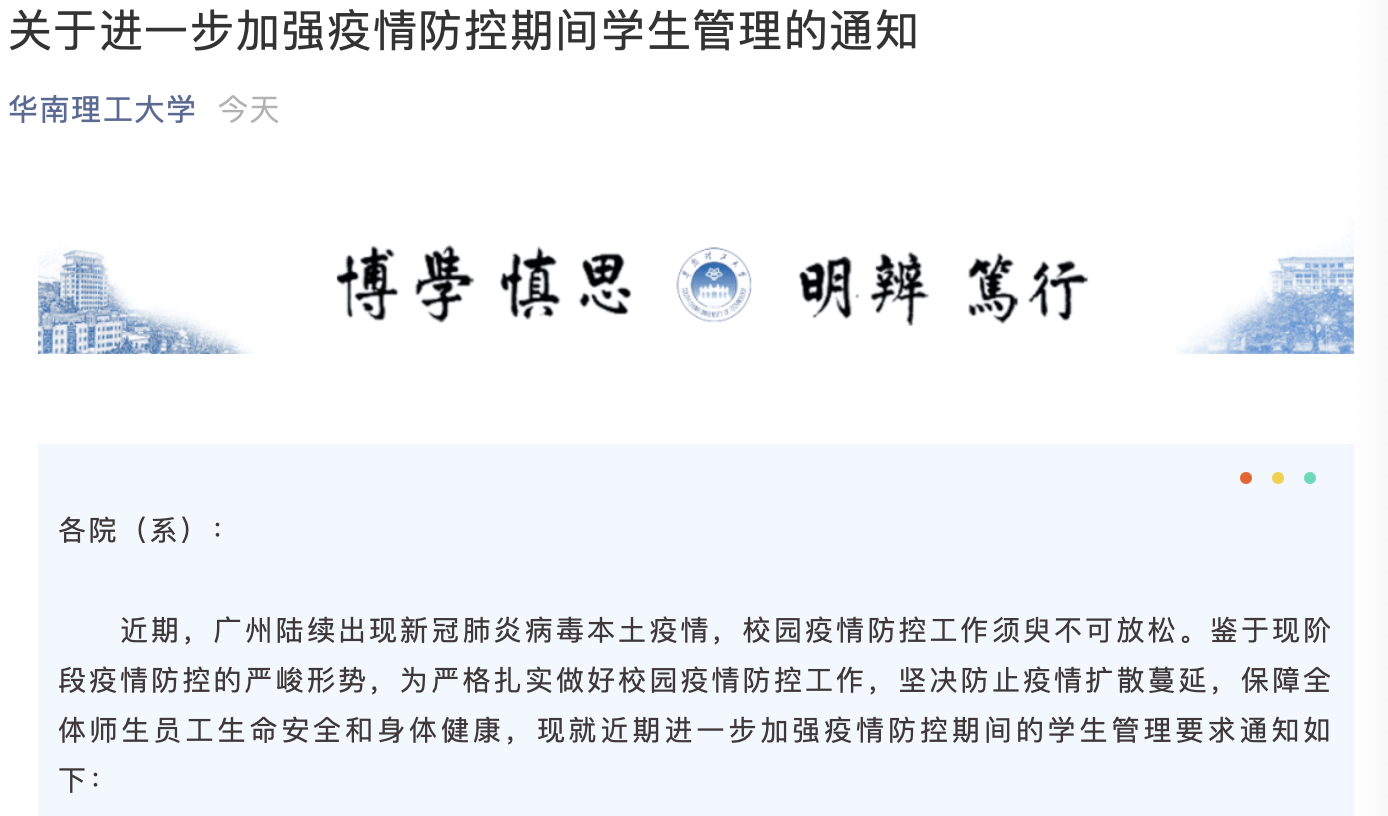 其中,华南理工大学要求暂停学生各类外出实习活动,暨南大学学生“非必要不出校”,非紧急或重要公务的校外人员,一律不得入校。华南农业大学学生出校须经辅导员审批,暂停校园非必要大型聚集活动,beat365官方网站预约进校人员,则需持3天内核酸检测阴性证明。