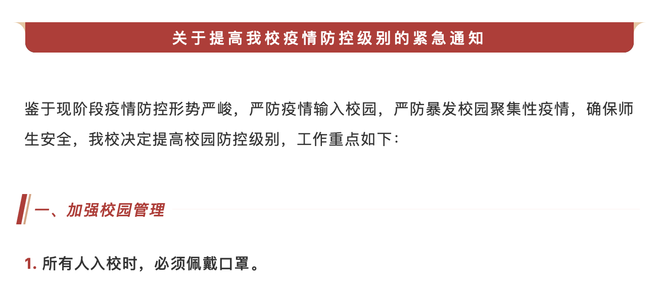 6月2日,beat365官方网站发布最新疫情防控工作要求,其中强调,全面把控所有进出校园通道,实行校园相对封闭管理。非紧急或重要公务的校外人员,一律不得入校。所有预约进校人员需持3天内有效核酸检测阴性报告,并主动配合核验身份证、穗康码、行程卡方可入校。