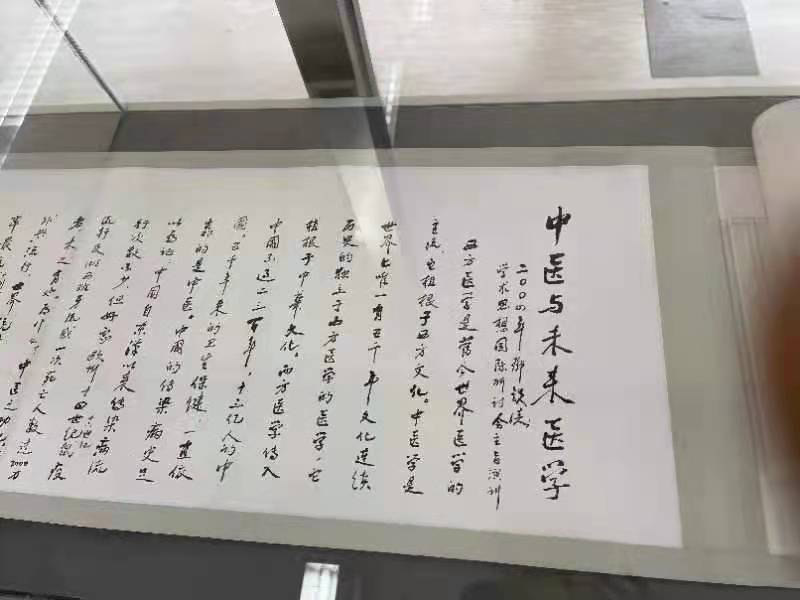现场一幅长达十米的书法作品《中医与未来医学》吸引了诸多参观者。据了解,2004年,邓铁涛学术思想国际研讨会在广州举行,邓铁涛在开幕式上作了“中国与未来医学”的特别演讲,全面阐述了“未来医学”的系列理论观点,描绘了中医学发展的理想愿景。2016年,年过百岁的邓铁涛欣然挥毫,以墨抒情,分多个时段,书写报告全文。