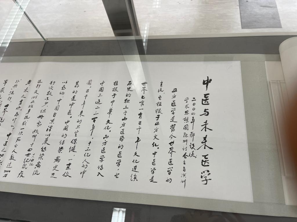 现场一幅长达十米的书法作品《中医与未来医学》吸引了诸多参观者