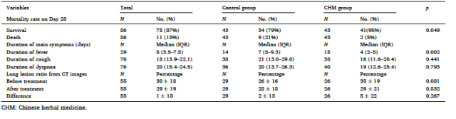 研究还发现:中医治疗后,发热、咳嗽和呼吸困难等主要症状改善,发热持续时间明显短于对照组(4天Vs 7天),且对比具有统计学差异。