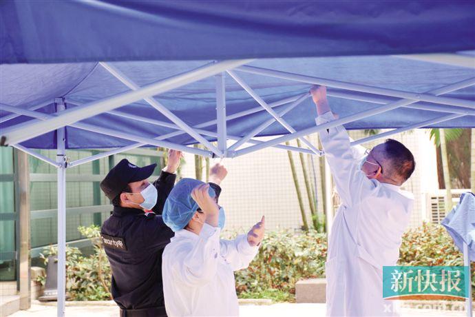 “吴主任,帐篷到啦!”吴成林与几个同事马上合力将帐篷支了起来。“这就是我们日后的临时隔离区了。”他介绍,“日后学生在进入门诊部就诊前要在门口先预检,有接触史、体温不正常要先在这里隔离,等救护车接去定点医院。”