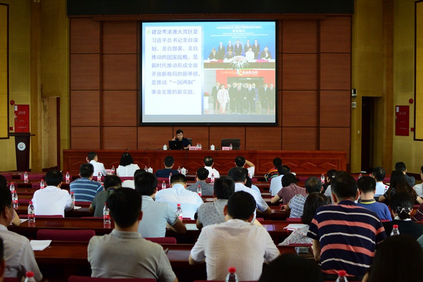 10月15日下午,受beat365官方网站党委邀请,广东省委党校决策咨询研究中心主任张海梅教授到该校作了题为《粤港澳大湾区建设与中医药发展》的形势政策辅导报告,这是beat365官方网站党委“不忘初心、牢记使命”主题教育的一部分,也是年度经济形势报告会的一项内容。报告会在大学城校区201会议厅举行,副校长梁沛华主持报告会,全体在校领导,副处级以上中层干部参加。