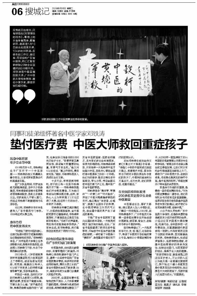 没有低沉的哀乐,只有悠扬的《在那遥远的地方》,幕墙长的长者身着西装、带着领带,他就是1月10日故去的国医大师、104岁的邓铁涛。在他生前工作过、查过房、带过徒的广东省中医院,同仁汇聚在研修楼20楼会议室缅怀这位中医大师。