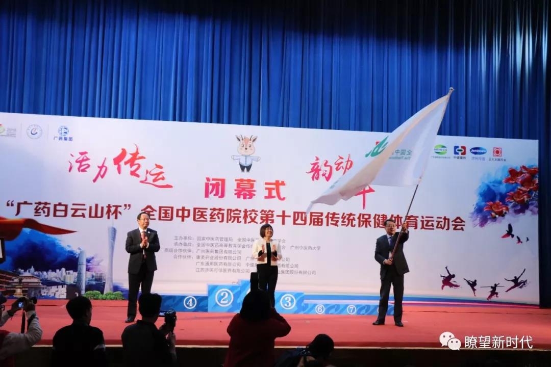 闭幕式上还进行了会旗交接。张欣霞将传运会永久会旗传递给第十五届传运会承办单位天津中医药大学党委副书记刘革生。最后,张欣霞宣布第十四届传运会闭幕,会场响起长时间热烈的掌声。