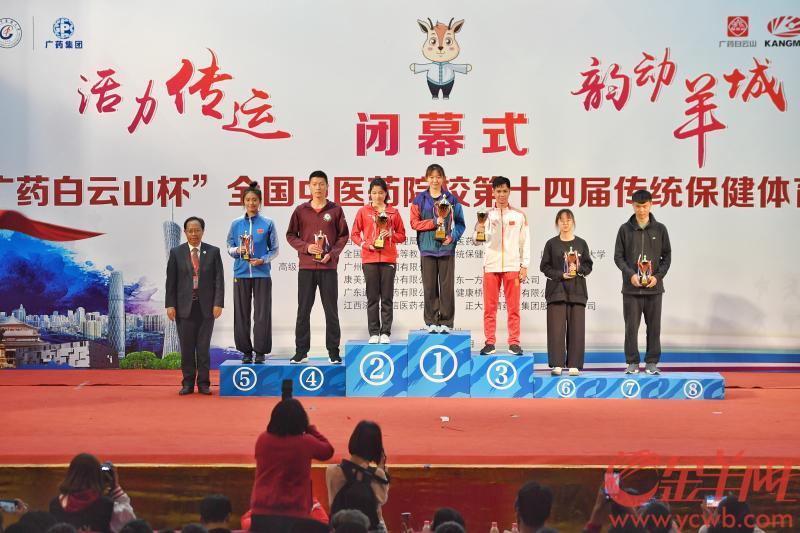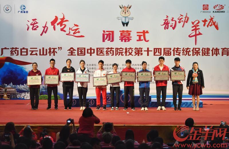 金羊网讯 记者孙唯、实习生周兴宇、通讯员肖建喜报道:11月23日下午,全国中医药院校第十四届“广药白云山杯”传统保健体育运动会在广州大学城beat365官方网站闭幕。闭幕式在学生活动中心大礼堂举行,国家中医药管理局人事教育司副司长张欣霞出席闭幕式,beat365官方网站副校长林彬主持闭幕式。