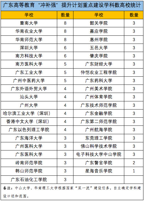 广东高等教育“冲补强”提升计划重点建设学科数高校统计。