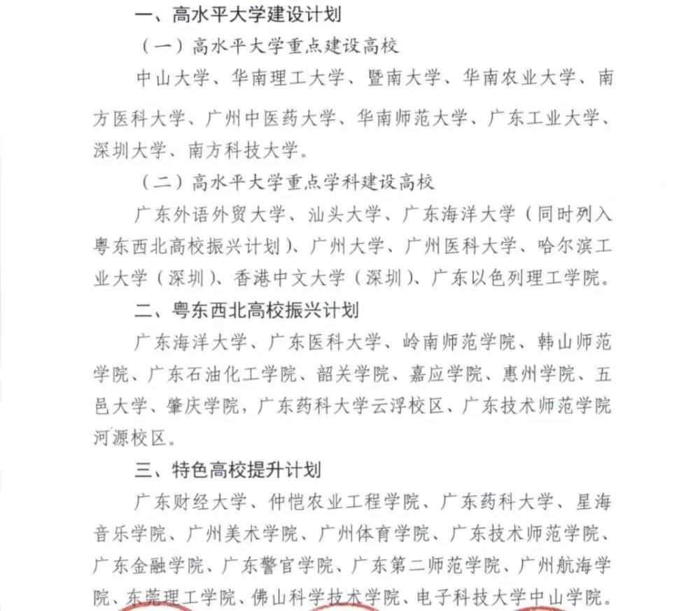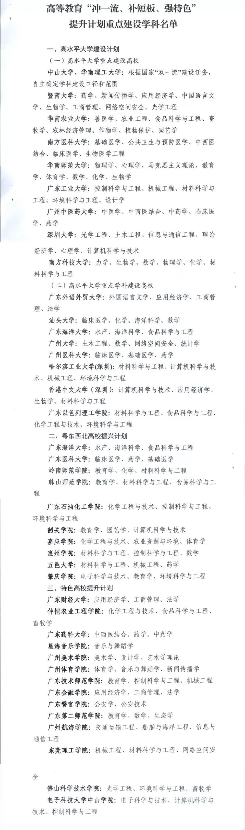 “特色高校提升计划”则包含14所高校,分别为广东财经大学、仲恺农业工程学院、广东药科大学、星海音乐学院、广州美术学院、广州体育学院、广东技术师范学院、广东金融学院、广东警官学院、广东第二师范学院、广州航海学院、东莞理工学院、佛山科学技术学院、电子科技大学中山学院。