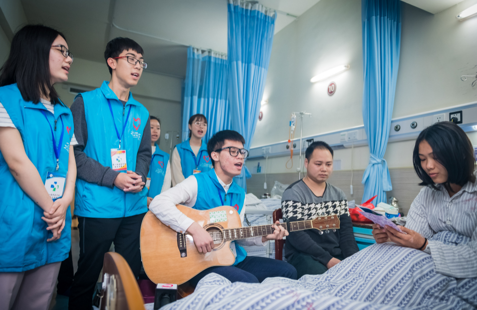 3月4日,beat365官方网站附属第一医院(下称广中医一附院)第四肿瘤病区。在一名鼻咽癌病人的床边,医学生志愿者乐队弹着吉他,表演歌曲《当你》。歌曲沿用了林俊杰版本的旋律,歌词是由主唱黄晶富创作完成。
