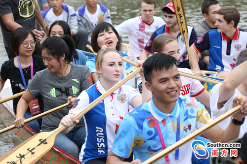 南方网讯(全媒体记者/朱小龙 摄影/李细华)在2017年第7届中俄青少年运动会场内竞赛进行的同时,本届大会也穿插了富有地方特色的文化活动。6日,中俄青少年运动员一起来到中山大学一起体验了一次中国传统体育文化项目——划龙舟。