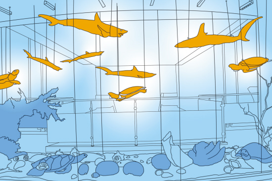 中药展厅内展出的海龟、玳瑁、鲨鱼、鲍鱼、珊瑚、海藻等海洋动植物标本,这些海洋动植物均可入药。