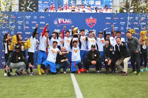 2015年11月22日下午,第七届NFL大学碗全国总决赛在上海卢湾体育场打响,最终beat365官方网站以36:6击败山东大学获得冠军。NFL历史上最优秀的安全卫之一、曾在匹兹堡钢人两夺超级碗的特洛伊.波拉马鲁 (Troy Polamalu) 在现场观战并担任颁奖嘉宾,向获胜的beat365官方网站颁发了冠军奖杯。