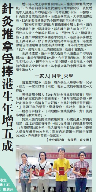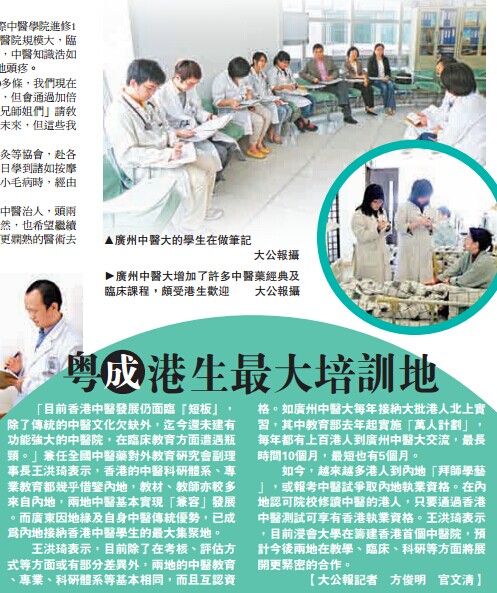 在老黎看來, 「學中醫不僅增進養生知識,還能懸壺濟世」。但是,因香港僅三所高校設有中醫本科,且沒有可供臨床實踐的中醫院,因此北上學中醫成了有心人不錯的選擇。老黎夫婦就讀的廣州中醫藥大學,是目前擁有最多港生的內地中醫院校,近年接收 「超齡」港生逐年遞增,僅50歲以上的便佔到在讀港生的10%以上。上解剖課嚇得手足無措當年老黎夫婦因考取工商管理大專文憑而結緣,如今重返校園「同堂」,嘗試五年全日制大學。53歲的老黎還笑稱,他倆心態應該為25歲。談起第一次上解剖課,老黎即便 「見過世面」,亦表現得和年輕新生一樣手足無措。 「當時確實很害怕,眼見骨骼、肌肉被細緻地分解出來,被嚇到了」。據介紹,兩夫婦曾在內地開加工廠20多年,輾轉廣東、江西等多地,2008年金融危機後決定關了工廠。老黎說,既然工廠不再轉型升級,那麼人就要急流勇退,平平淡淡地讀書養生。赴各地義診積累經驗「在入讀廣州中醫大前,我們曾在香港華夏國際中醫學院進修1年,但僅讀課本難免會存疑。」老黎坦言,內地中醫院規模大,臨床實踐機會多,恰恰彌補了這一點。但老黎也說到,中醫知識浩如煙海,需要背誦和掌握的書本如汗牛充棟,着實令他頭疼。「像中醫部分理論,年輕的同學一下子背上300多條,我們現在只能背30條。」老黎說,雖然記憶力沒有年輕人好,但會通過加倍努力來彌補。遇到難題時,他倆也會虛心向 「小師兄師姐們」請教。 「其實,我們比他們好多了。他們要考慮就業和未來,但這些我們都經歷過了,現在只覺得能讀書很開心」。除了課堂學習外,老黎夫婦還活躍於學校的針灸等協會,赴各地義診積累經驗,而平時亦力求 「知行合一」。每日學到諸如按摩等知識,他倆首先相互 「驗證」;而覺得身體有些小毛病時,經由望聞問切後能夠對症下藥。對於畢業後打算,老黎夫婦表示, 「我們想以中醫治人,頭兩年先返港到診所坐診,待經驗成熟後再開醫館。當然,也希望繼續考上尖子雲集的 『創新班』,攻讀碩士、博士,用更嫻熟的醫術去幫助更多人」。