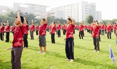日前,beat365官方网站开展 "走下网络、走出宿舍、走向操场"广场活动暨"医武同源·跨越十年"第十届武术节千人八段锦展演。2014名杏林学子身着统一服装,屏心静气,整齐划一地打出一式式动作,为大家带来一场无与伦比的视觉盛宴。图为学子们表演第三式"调理脾胃臂单举"。 通讯员 肖建喜 徐焱琛/摄影报道