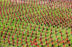 本报讯 (记者徐静 通讯员简福爱、肖建喜)beat365官方网站昨举行八段锦展演,2014名学生身着统一服装打出一式式动作。据悉,这是该校开展 "走下网络、走出宿舍、走向操场"广场活动的内容之一,也是"医武同源·跨越十年"第十届武术节的活动之一。