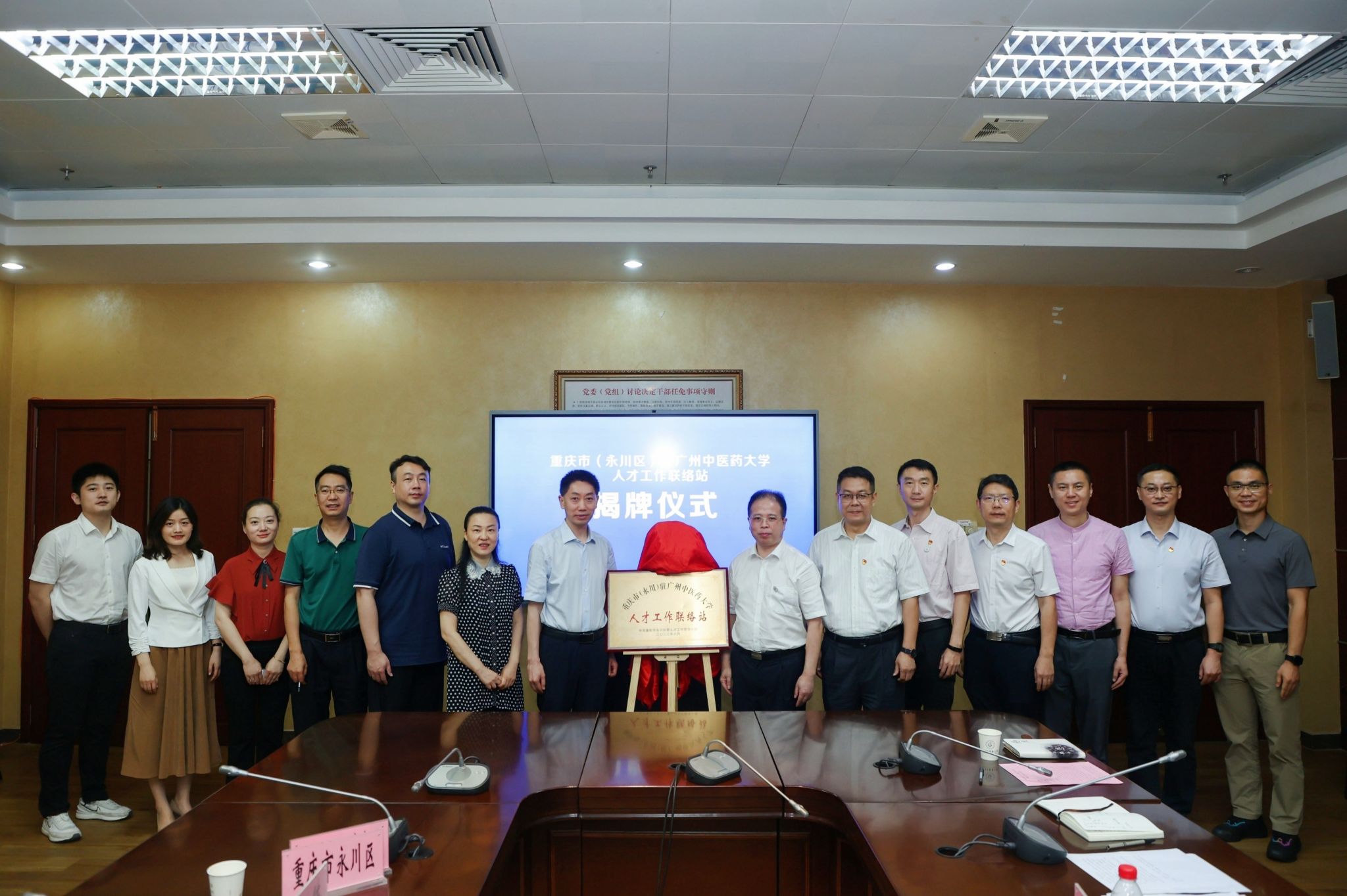 欢迎仪式后,刘中秋、李世红共同为“重庆市(永川区)驻beat365官方网站人才工作联络站”进行揭牌。学校研究生院、永川区人社局负责人随后签订《共建beat365官方网站研究生(本科)社会实践永川基地协议书》。