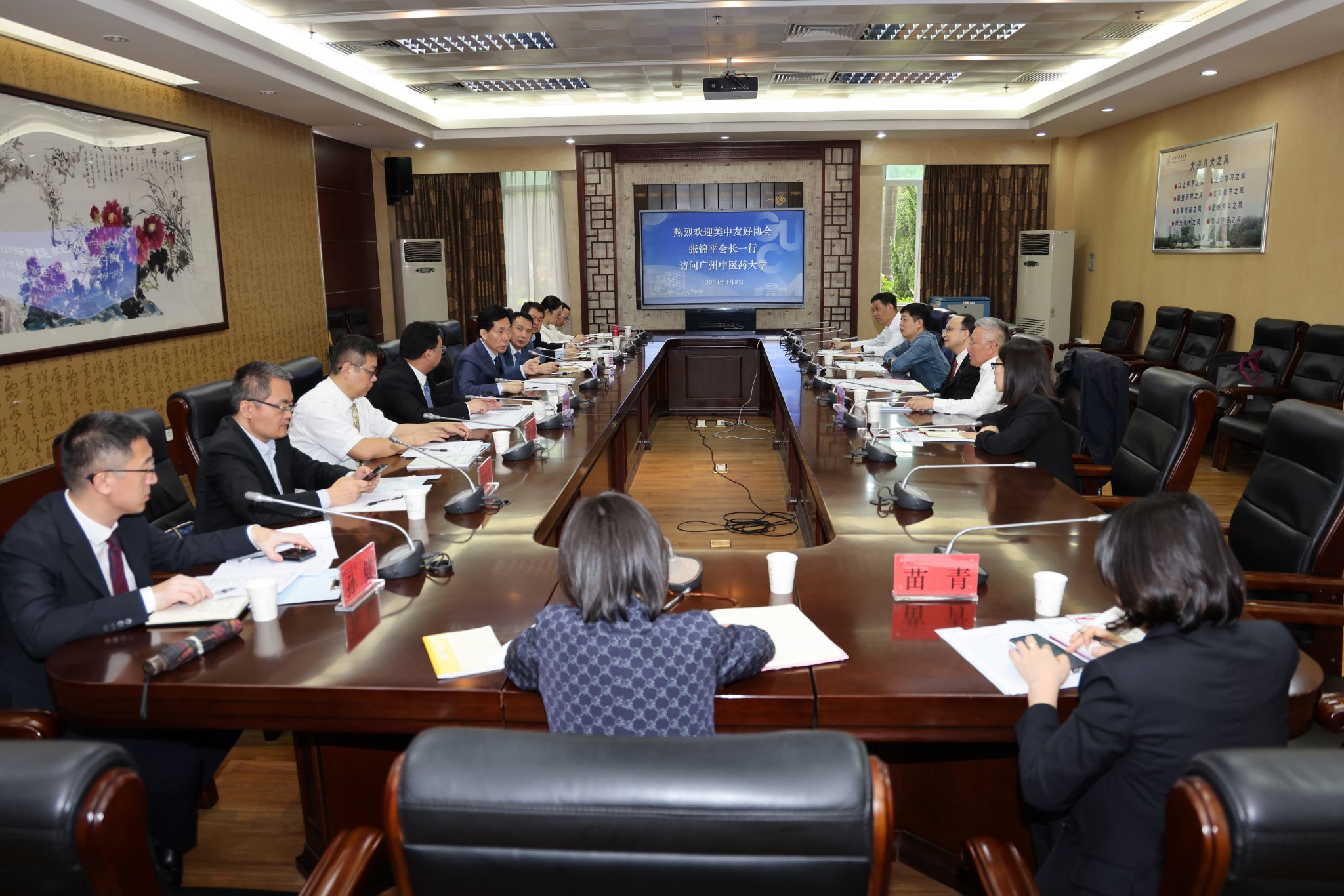 4月8日上午,美中友好协会会长张锦平、美国-中国中医药交流合作中心高级顾问邢继俊等一行,在广东省中医药局领导的陪同下访问我校。学校党委副书记、校长王伟,学校党委常委、副校长郭鸿出席座谈。