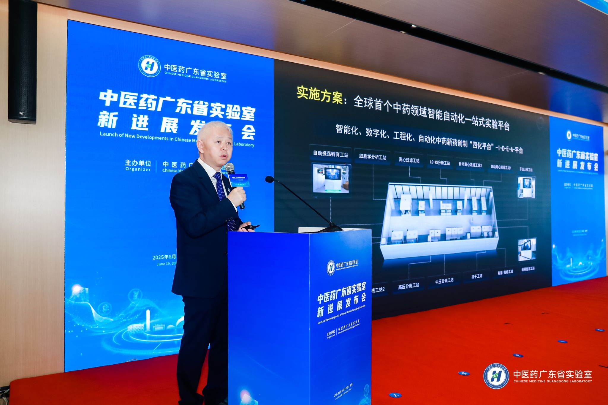 三是中药新药创制“四化平台”运行情况。为解决中药成分复杂难解析,机制模糊难验证的瓶颈问题,实验室打造全球首个智能化、数字化、工程化、自动化的中药新药创制“四化平台”。经充分调试与能力验证,完成14个工作站和2台机器人小车的全流程自动化对接,实现从中药化学馏分分离提取到细胞功能评价实验的全过程一站式无人化操作,高效率完成一味中药超2000个馏分的快速制备与分析,并回收90%以上实验耗材。四化平台自主研发突破20余项关键技术,已布局超20项的专利池。